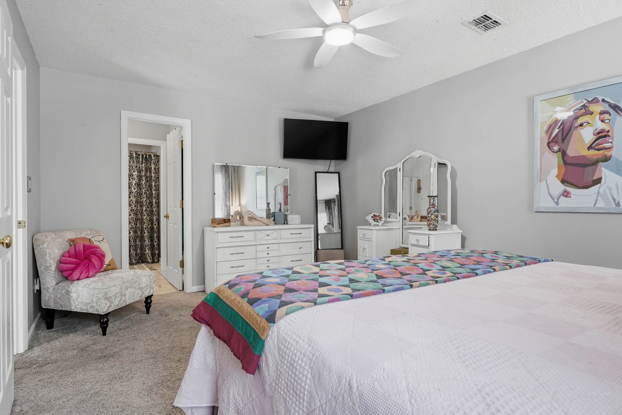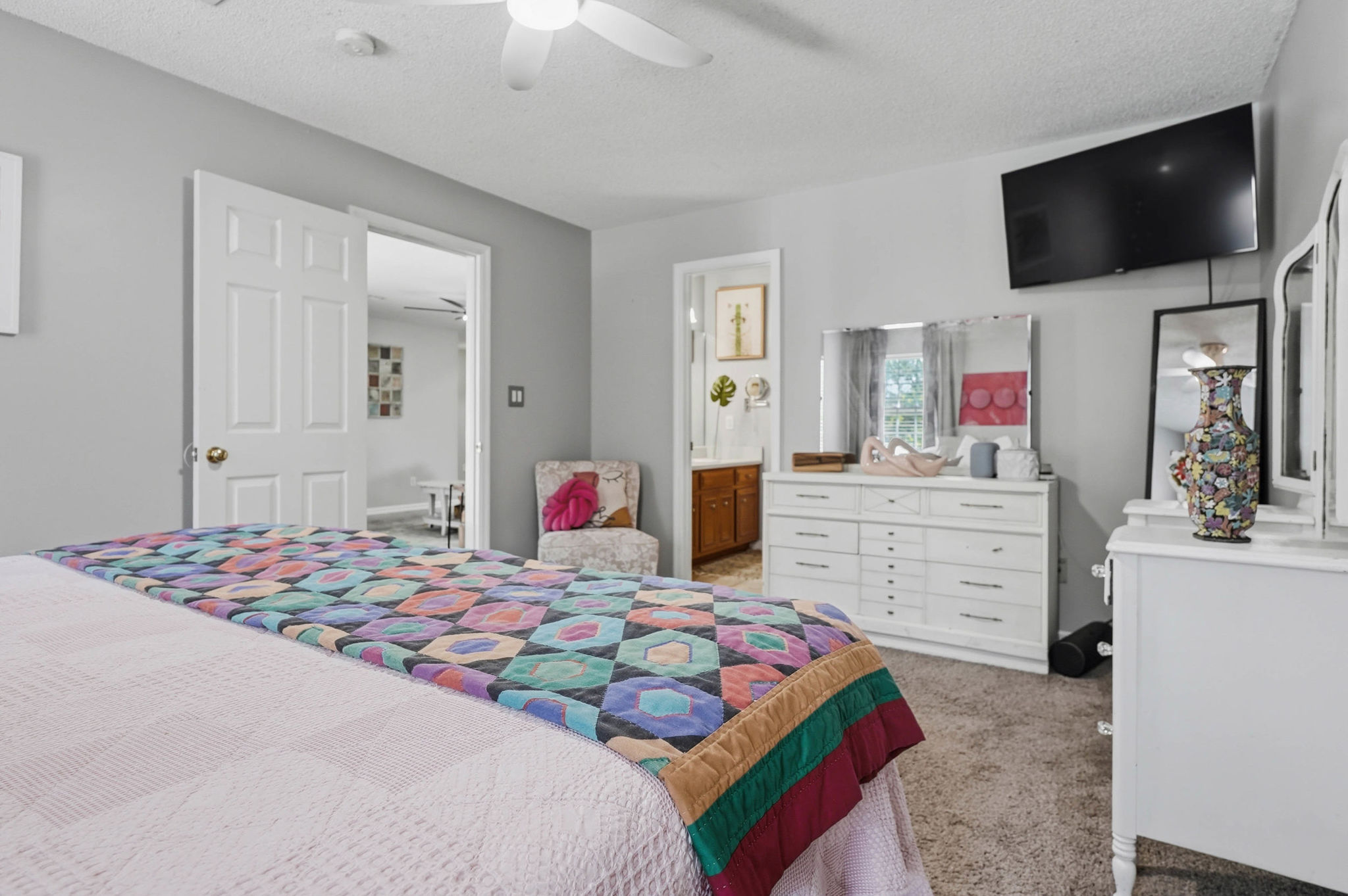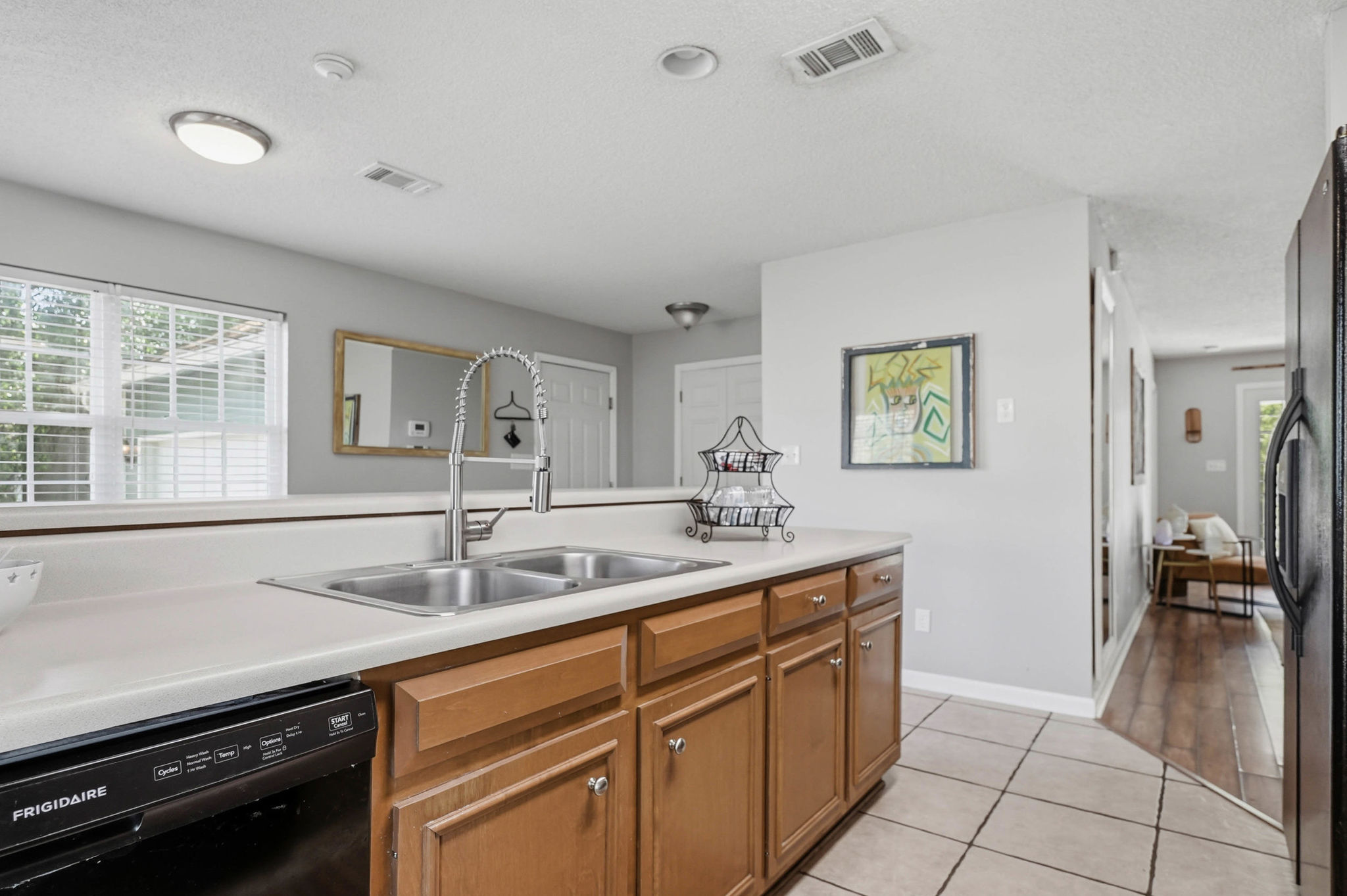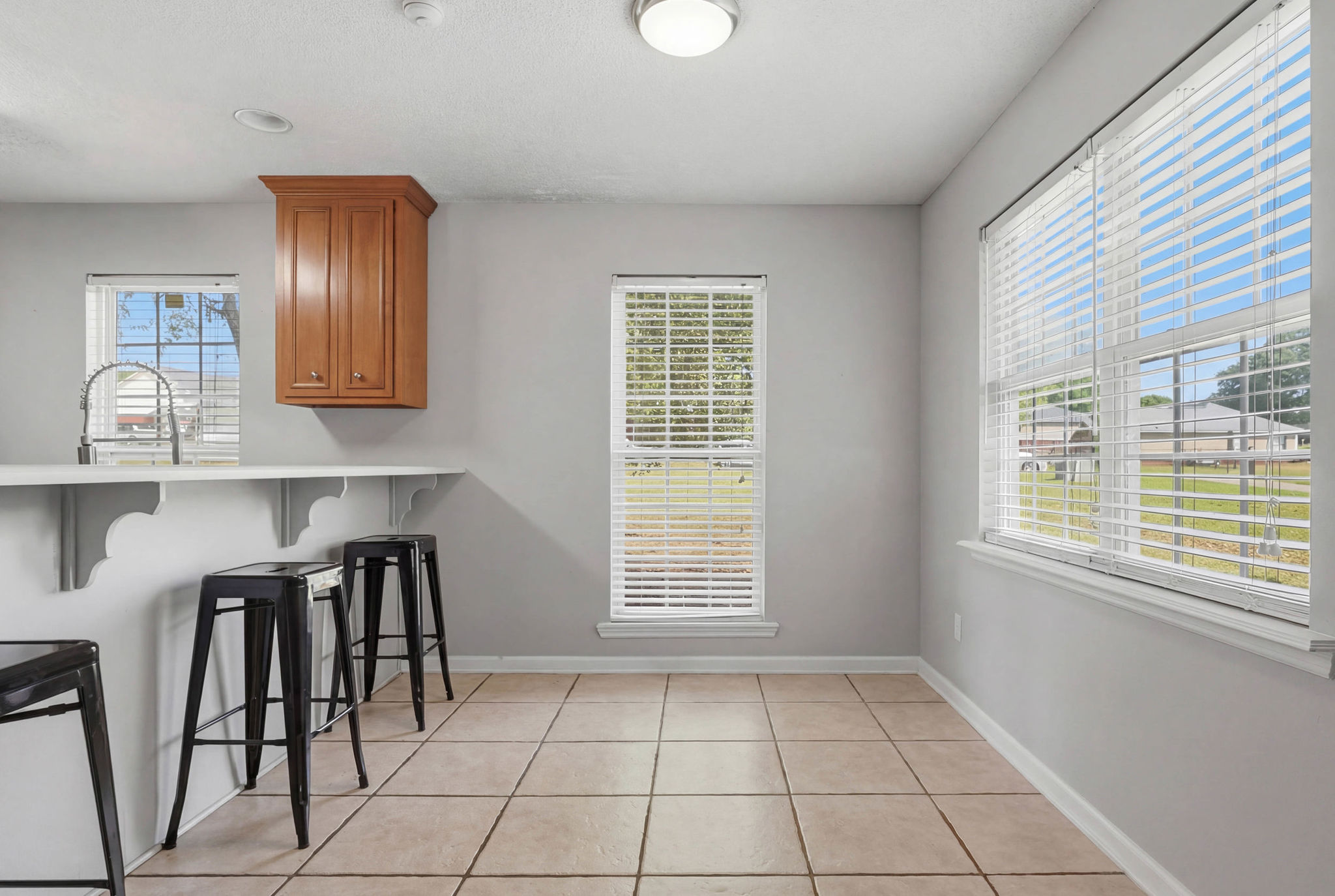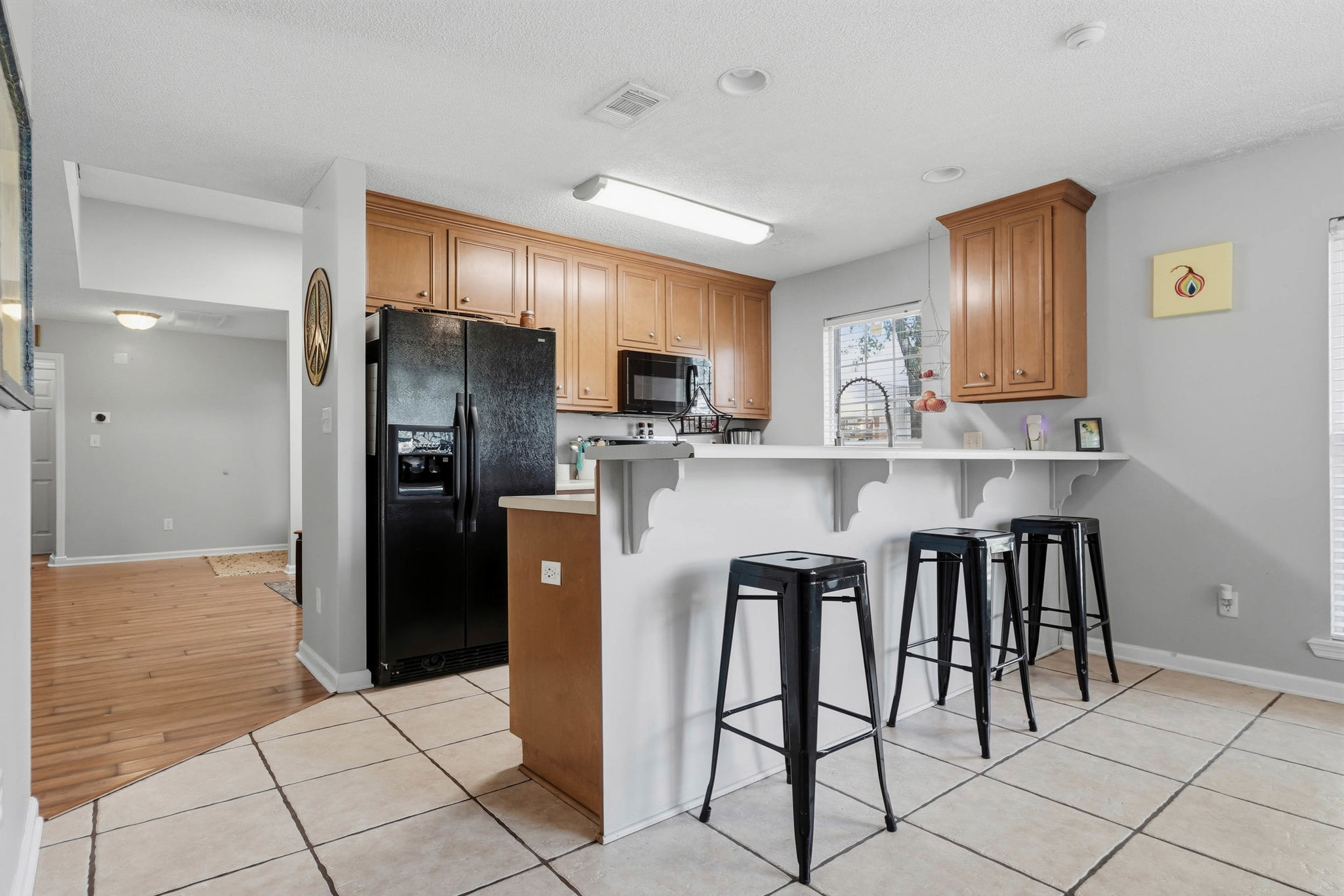 Inside, the home features a well-designed split floor plan that offers both privacy and flow. The primary suite is situated on one side of the home, complete with a walk-in closet and private bath, while two additional bedrooms and a full bathroom are positioned on the opposite side—ideal for family or guests. The open living and dining area serves as the heart of the home, providing a bright and welcoming space for gathering and entertaining. The kitchen is both functional and social, featuring a cozy breakfast area and a wraparound counter with additional seating, making it perfect for casual meals, morning coffee, or hosting friends and family.
